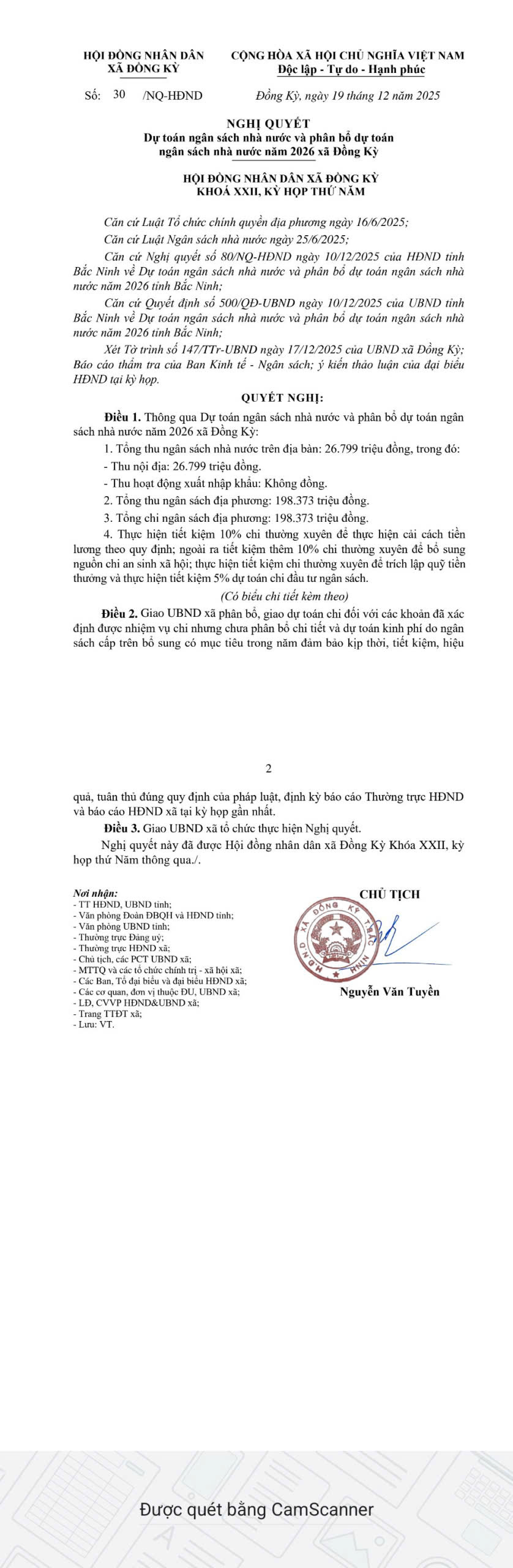 Ngày 19/12/2025 kỳ họp thứ Năm HĐND xã Đồng Kỳ đã thông qua Nghị quyết số 30/NQ-HĐND về Dự toán ngân sách nhà nước và phân bổ dự toán ngân sách nhà nước năm 2026 xã Đồng Kỳ