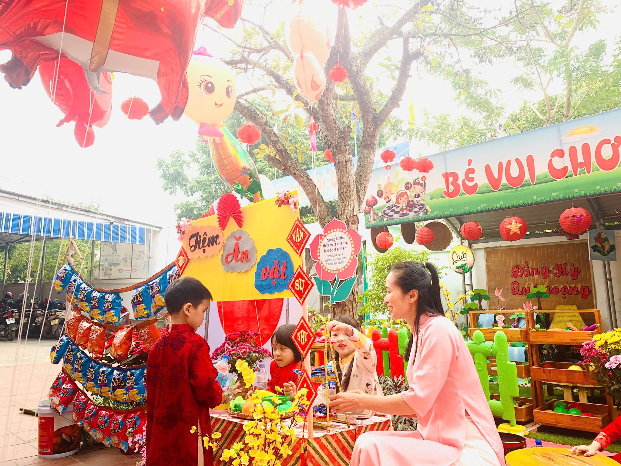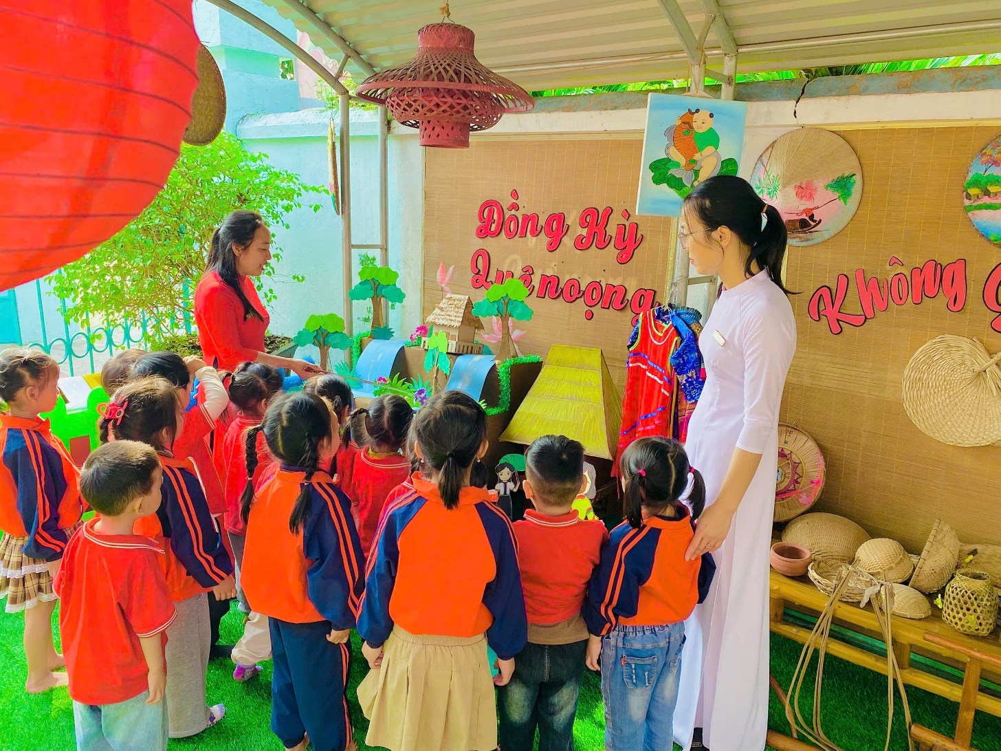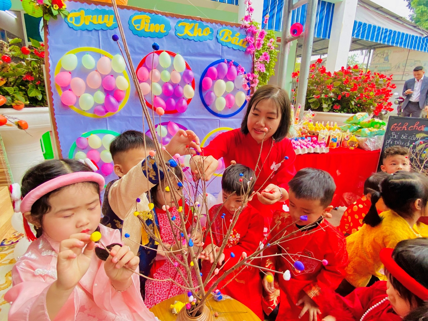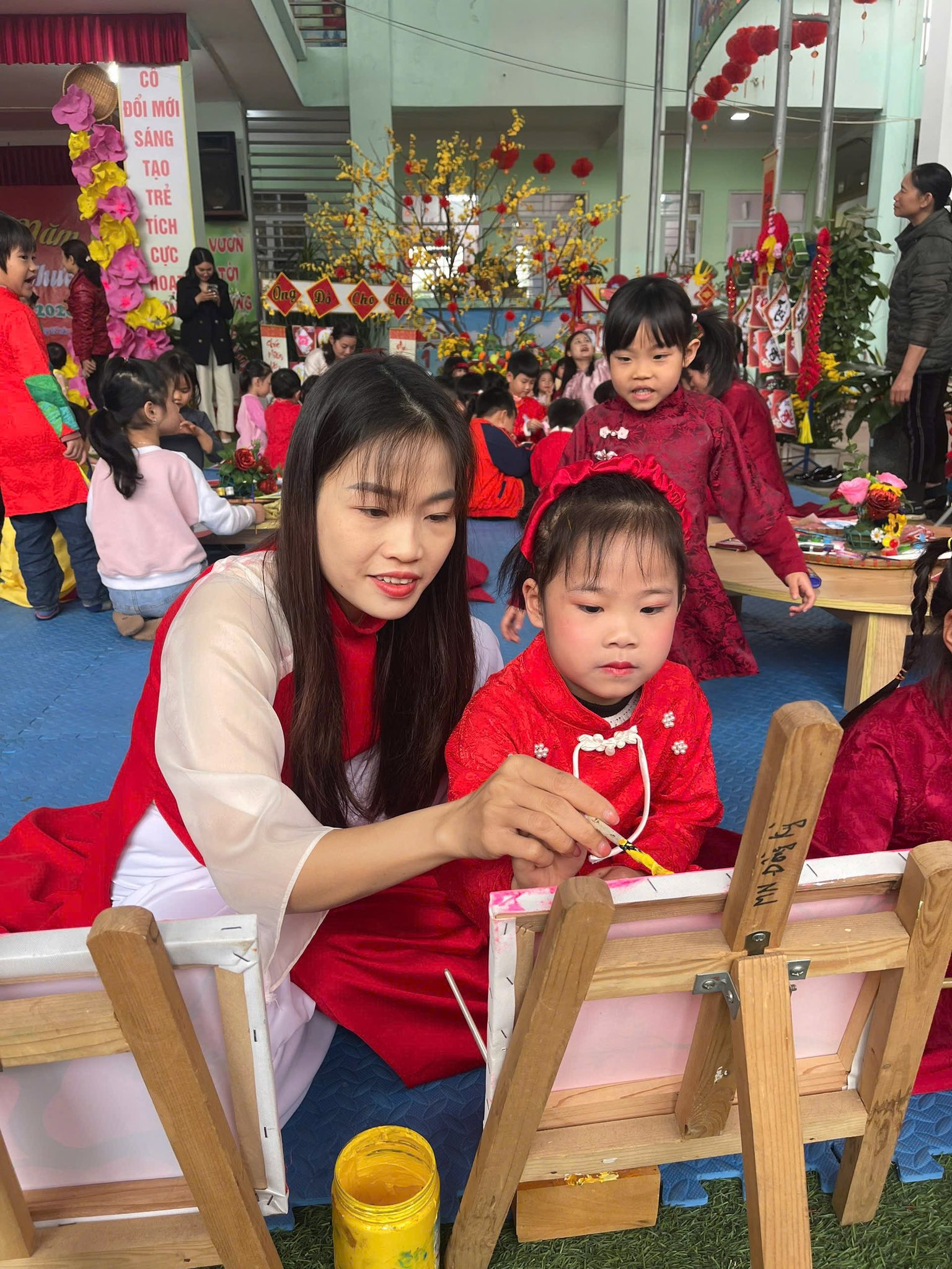 Hình ảnh giáo viên mặc áo dài đẹp cùng trẻ tham gia hoạt động trải nghiệm “ Xuân yêu thương năm 2026.