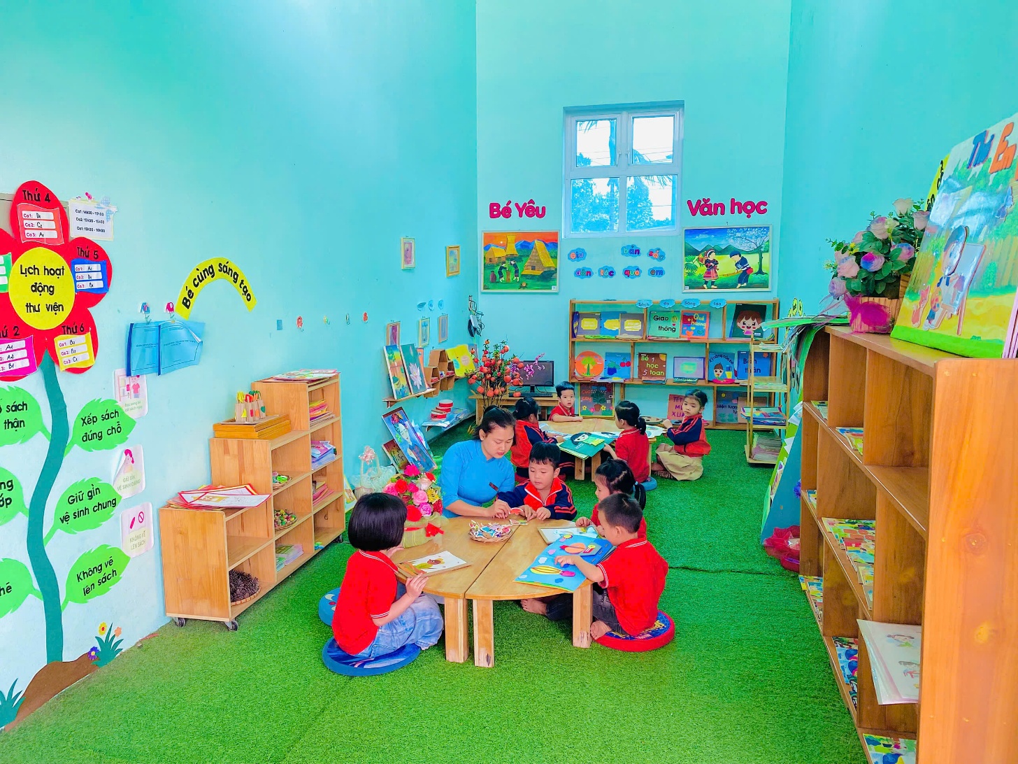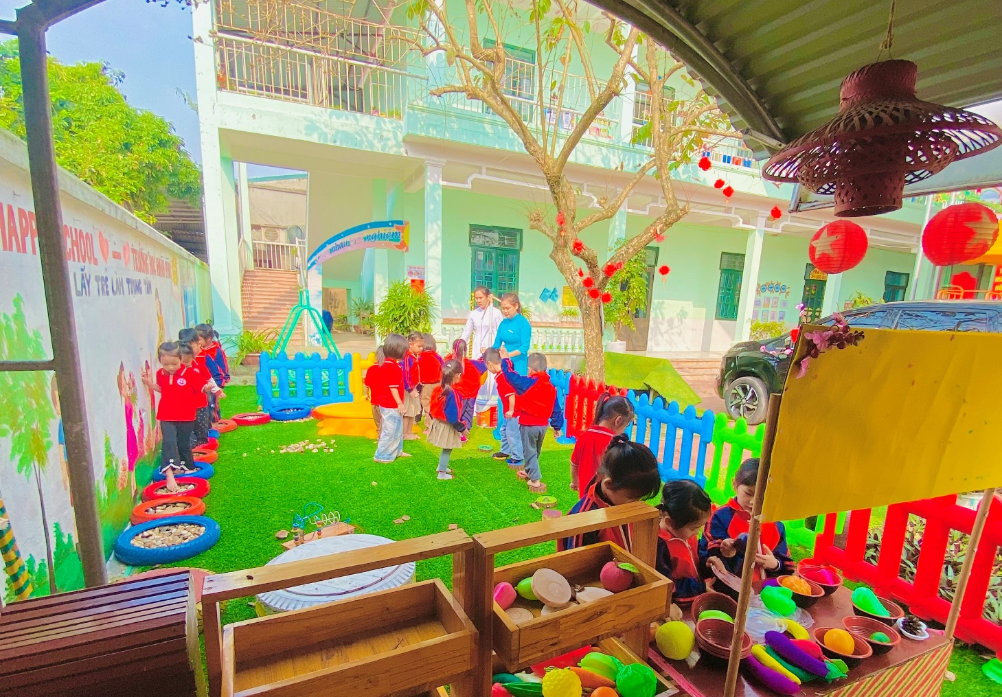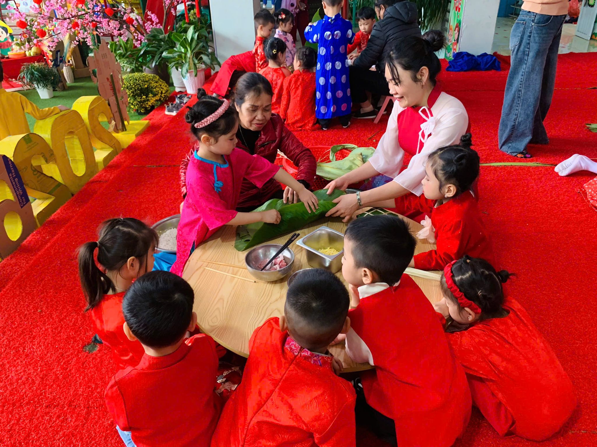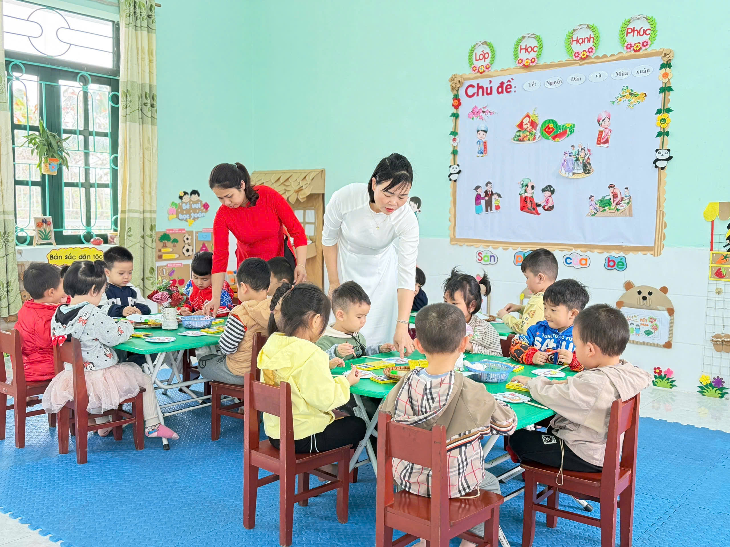 Hình ảnh giáo viên mặc áo dài đẹp cùng trẻ tham gia hoạt động trải nghiệm “ Xuân yêu thương năm 2026.