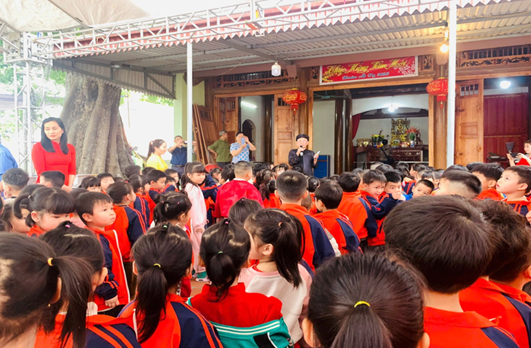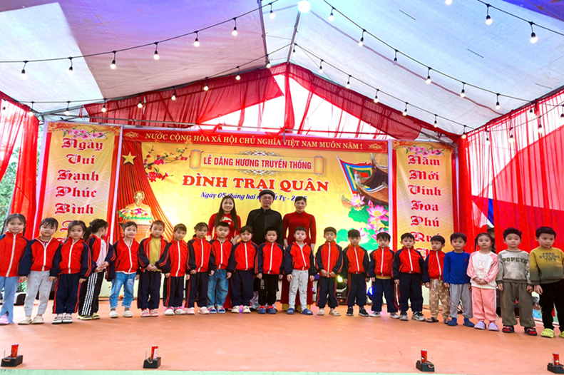 Hình ảnh các cô mặc trang phục áo dài khi cho trẻ trải nghiệm Lễ hội đình làng Trại Quân.