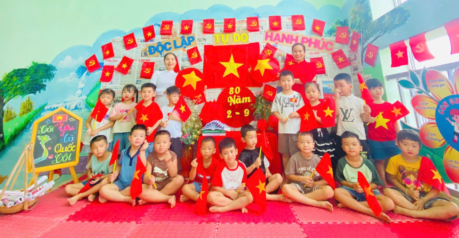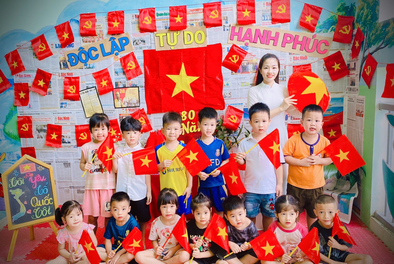 Hình ảnh giáo viên mặc áo dài đẹp chụp ảnh cùng trẻ chào mừng 80 năm Cách mạng tháng 8 và Quốc Khánh nước Cộng hoà xã hội chủ nghĩa Việt Nam mùng 2/9.