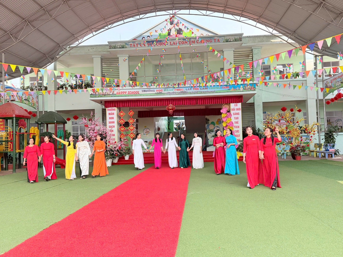 Hình ảnh các cô mặc trang phục áo dài tham gia Hội thi giáo viên mầm non dạy giỏi cấp trường chu kỳ 2026-2028.