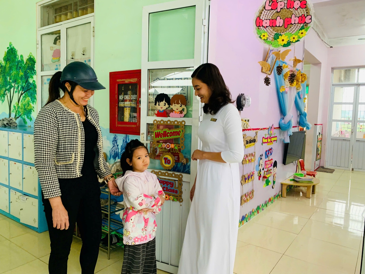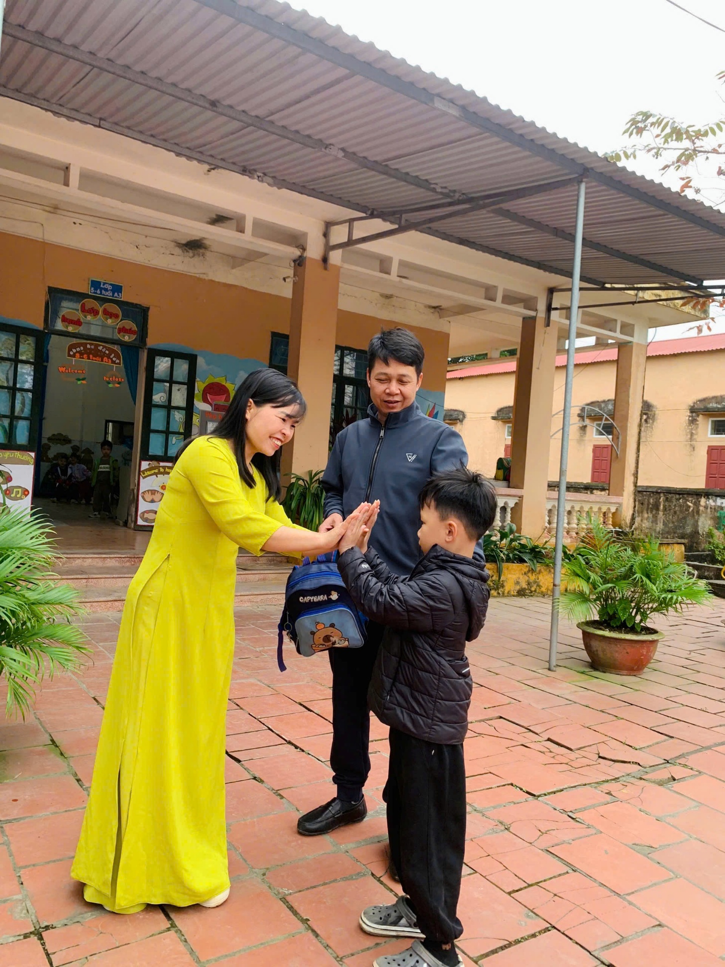 Hình ảnh các cô mặc áo dài trong hoạt động đón, trả trẻ.
