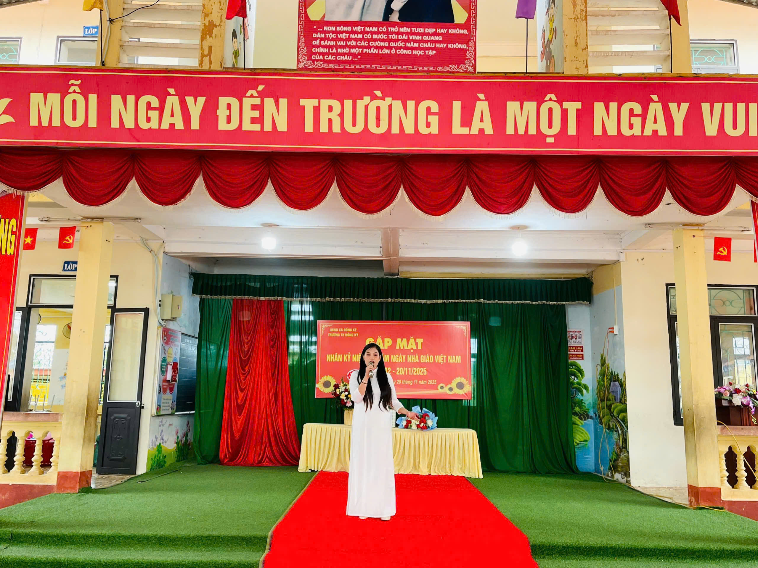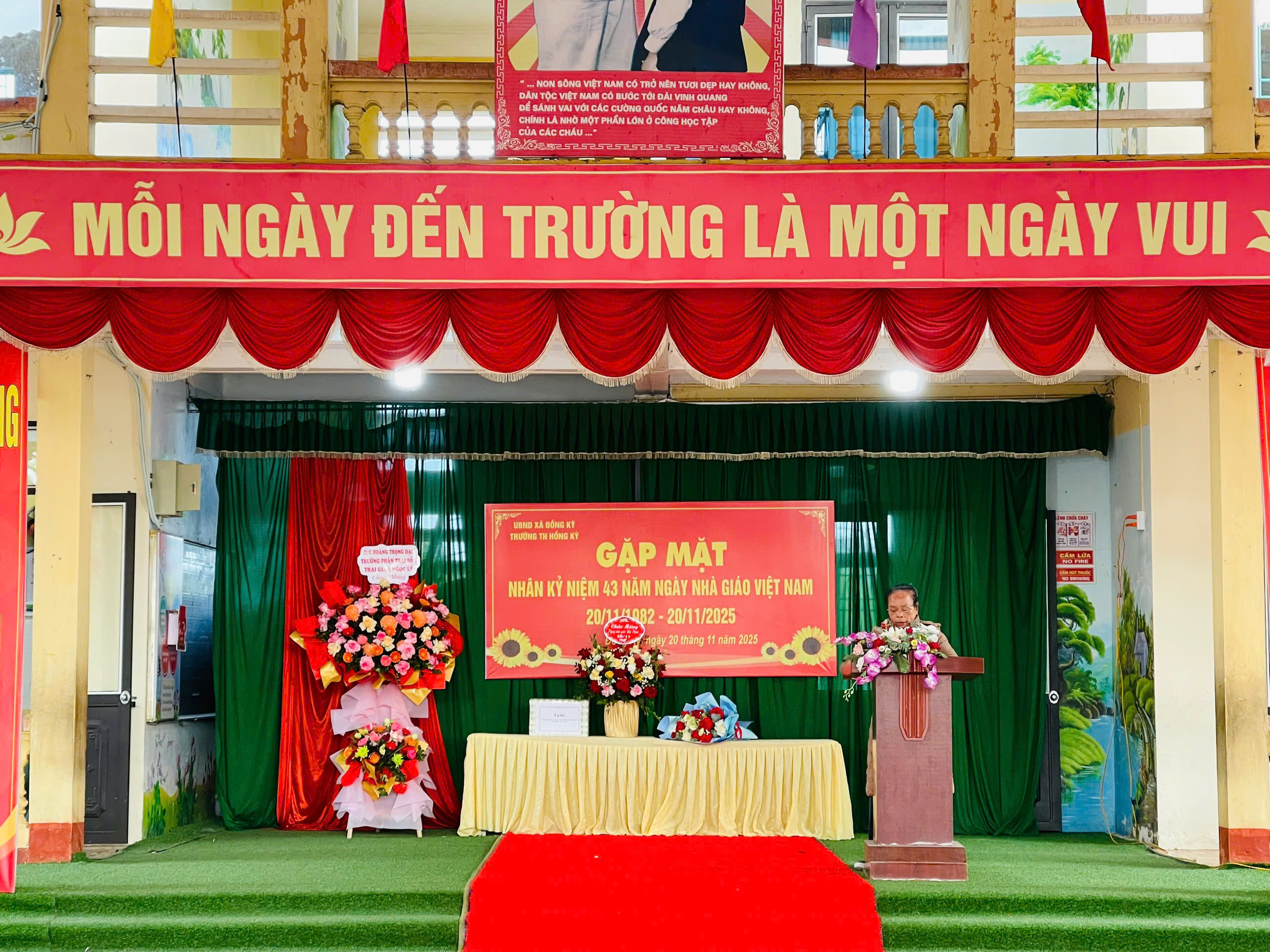 Cô đã thay mặt tập thể cán bộ giáo viên, nhân viên và các em học sinh nhà trường bày tỏ lời cảm ơn chân thành sâu sắc và mong muốn nhà trường sẽ luôn nhận được sự quan tâm nhiều hơn nữa của các cấp lãnh đạo ngành giáo dục cùng chính quyền địa phương và các cơ quan, ban ngành, đoàn thể; Gửi lời cảm ơn và tri ân đến các thế hệ giáo viên đã có nhiều đóng góp, cống hiến cho sự nghiệp “Trồng người” nói chung và cho sự phát triển giáo dục của trường Tiểu học Hồng Kỳ nói riêng.