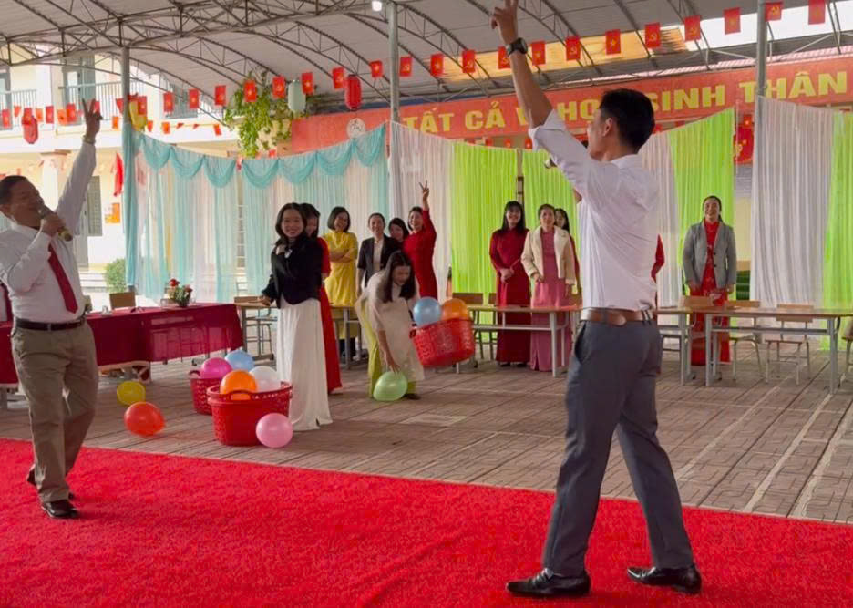 Sau phần lễ trang trọng, phần hội diễn ra vui tươi, hấp dẫn với trò chơi của các tổ trong nhà trường. Trò chơi diễn ra sôi nổi, thu hút sự cổ vũ nhiệt tình của giáo viên. Đây không chỉ là hoạt động tạo không khí vui tươi, đoàn kết mà còn là dịp để thầy cô giao lưu, tăng cường tinh thần tập thể và gắn kết giữa các tổ chuyên môn.