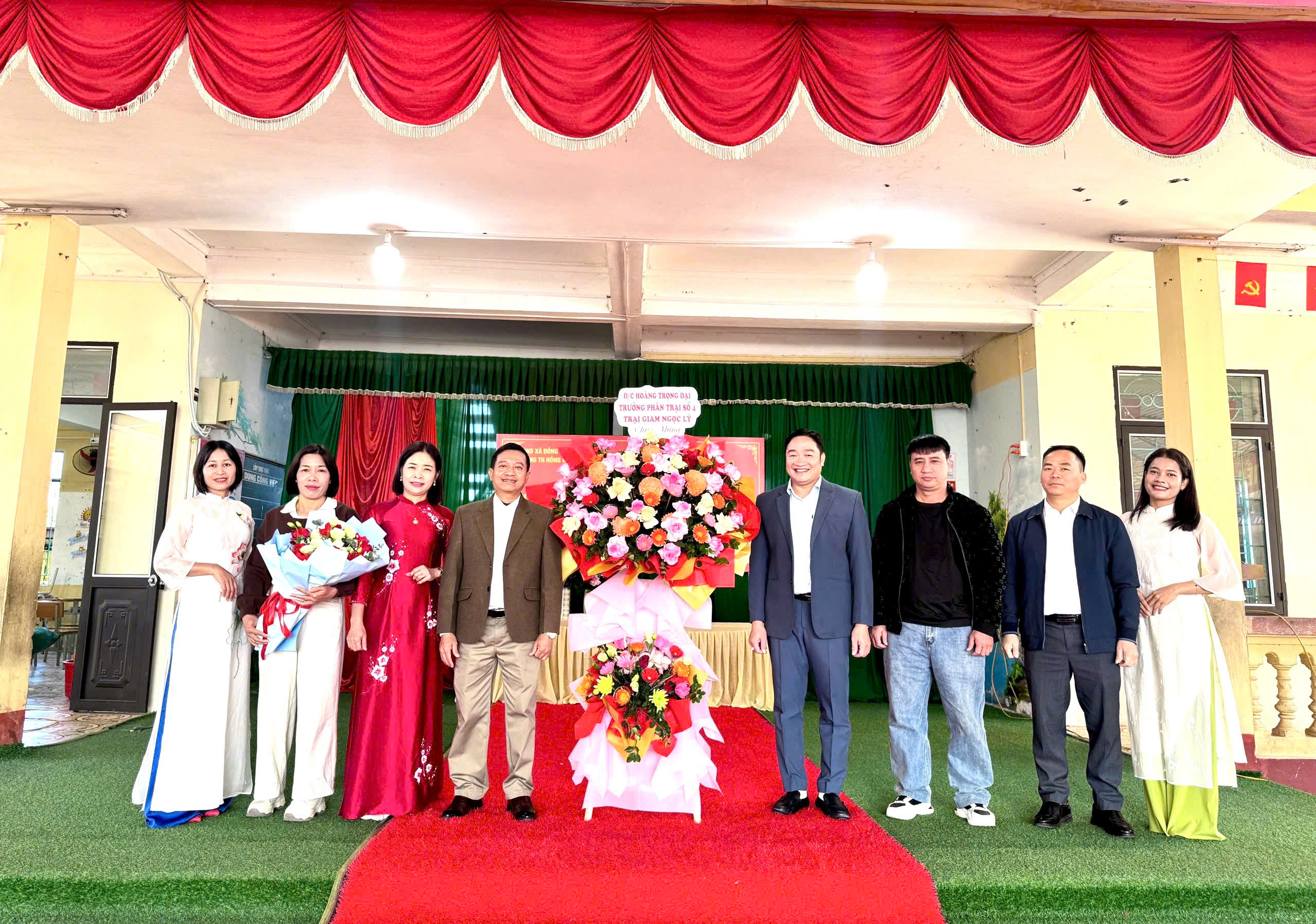 nhận hoa chúc mừng của các em học sinh