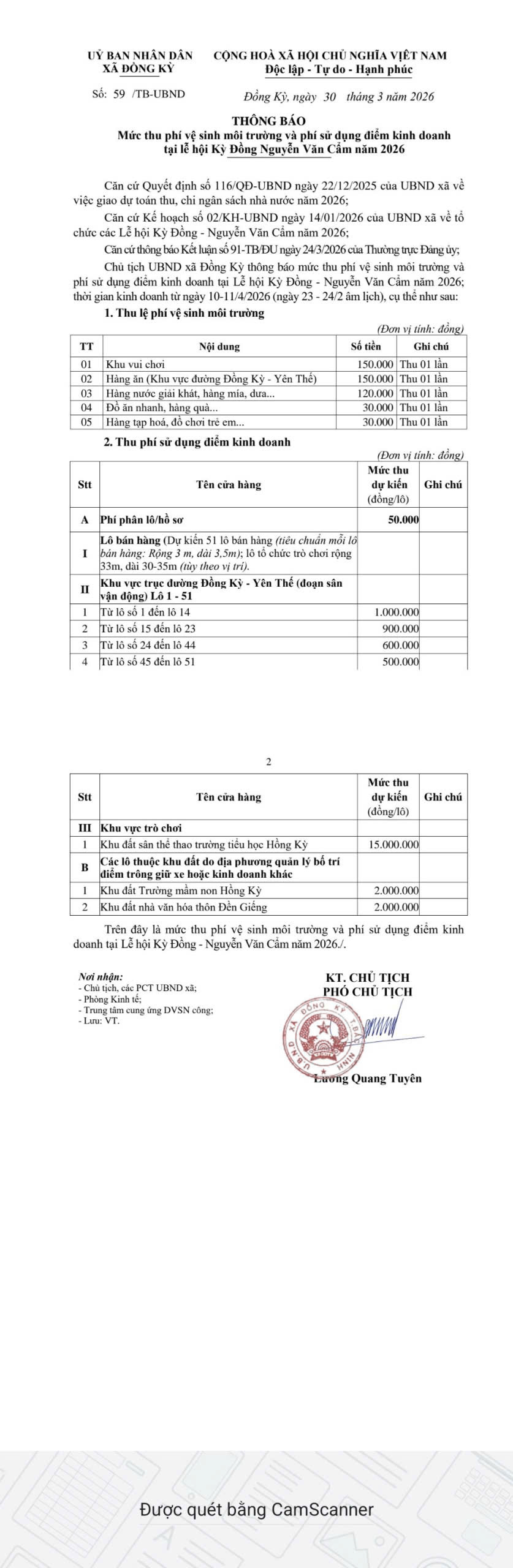THÔNG BÁO Mức thu phí vệ sinh môi trường và phí sử dụng điểm kinh doanh tại lễ hội Kỳ Đồng Nguyễn Văn Cẩm năm 2026